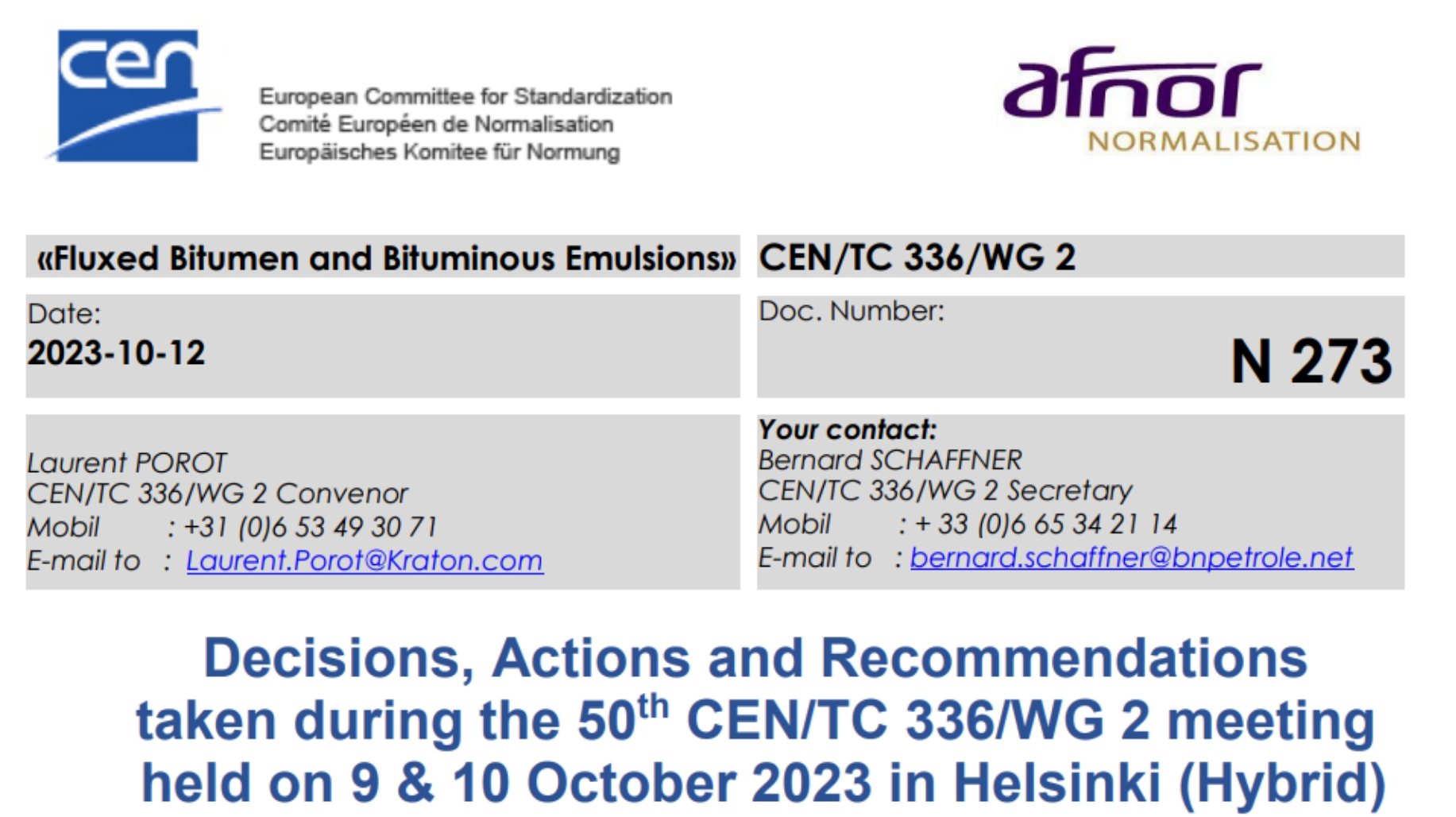 Los días 9 y 10 de octubre tuvo lugar en Helsinki (Finlandia) la 50ª reunión del grupo europeo de normalización CEN/TC336/WG2 en formato híbrido, presencial y vía telemática.
