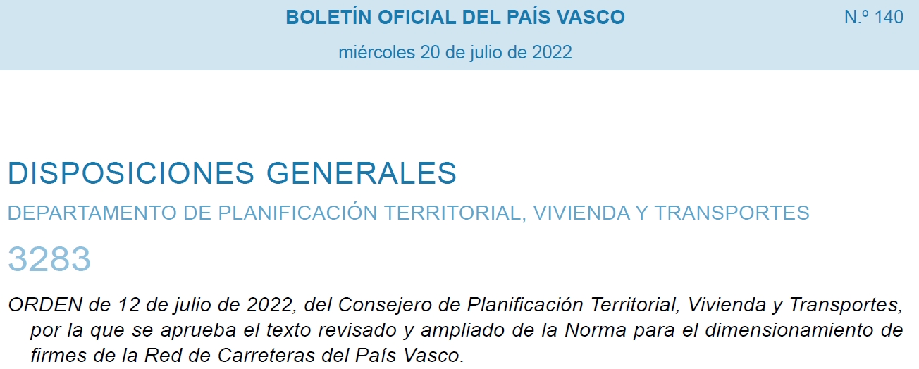 En el BOPV nº 140, se ha publicado la orden del 12 de julio de 2022 del Departamento de Planificación Territorial, Vivienda y Transportes donde se aprueba el texto revisado y ampliado de la Norma para el Dimensionamiento de Firmes de la Red de carreteras del País Vasco. En dicha actualización ha participado ATEB entre otras entidades. En esta nueva norma, además de hacer una revisión a los artículos que contenía la versión anterior de noviembre del 2012, se han publicado nuevos materiales, tales como mezclas bituminosas semicalientes y templadas que tienen un gran interés en cuanto a la sostenibilidad ambiental al permitir utilizar menores temperaturas de fabricación y puesta en obra. Estos materiales se introducen en el capítulo 7 de la Norma y se incluye un anejo específico de prescripciones técnicas para las mezclas templadas, ya que éstas no cuentan con el correspondiente artículo del PG-3.